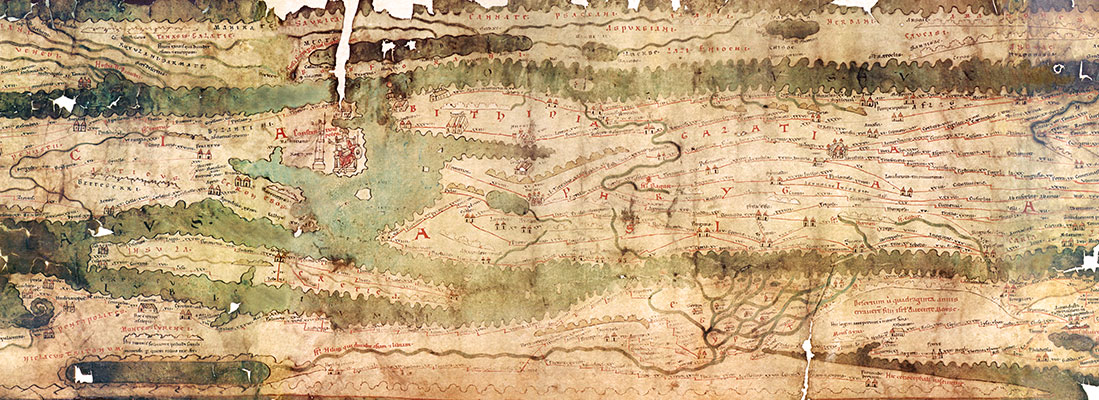 Tabula Peutingeriana, Ausschnitt, Tinte auf Pergament, 660 x 37 cm | Wien, Österreich, 12./13. Jh. | Österreichische Nationalbibliothek.