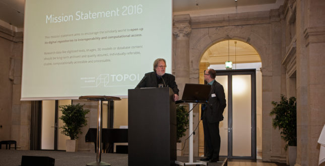 Der Exzellenzcluster Topoi setzt sich dafür ein, dass Bibliotheken, Archive, Museen und Bildungseinrichtungen ihre Digitalisate als computerlesbare Objekte weltweit uneingeschränkt und zitierfähig zur Verfügung stellen. Aus diesem Grund hat der Exzellenzcluster Topoi eine ergänzende Note zur Berlin Declaration on Open Access in the Sciences and Humanities formuliert, die im Rahmen der Veranstaltung unterzeichnet wird.