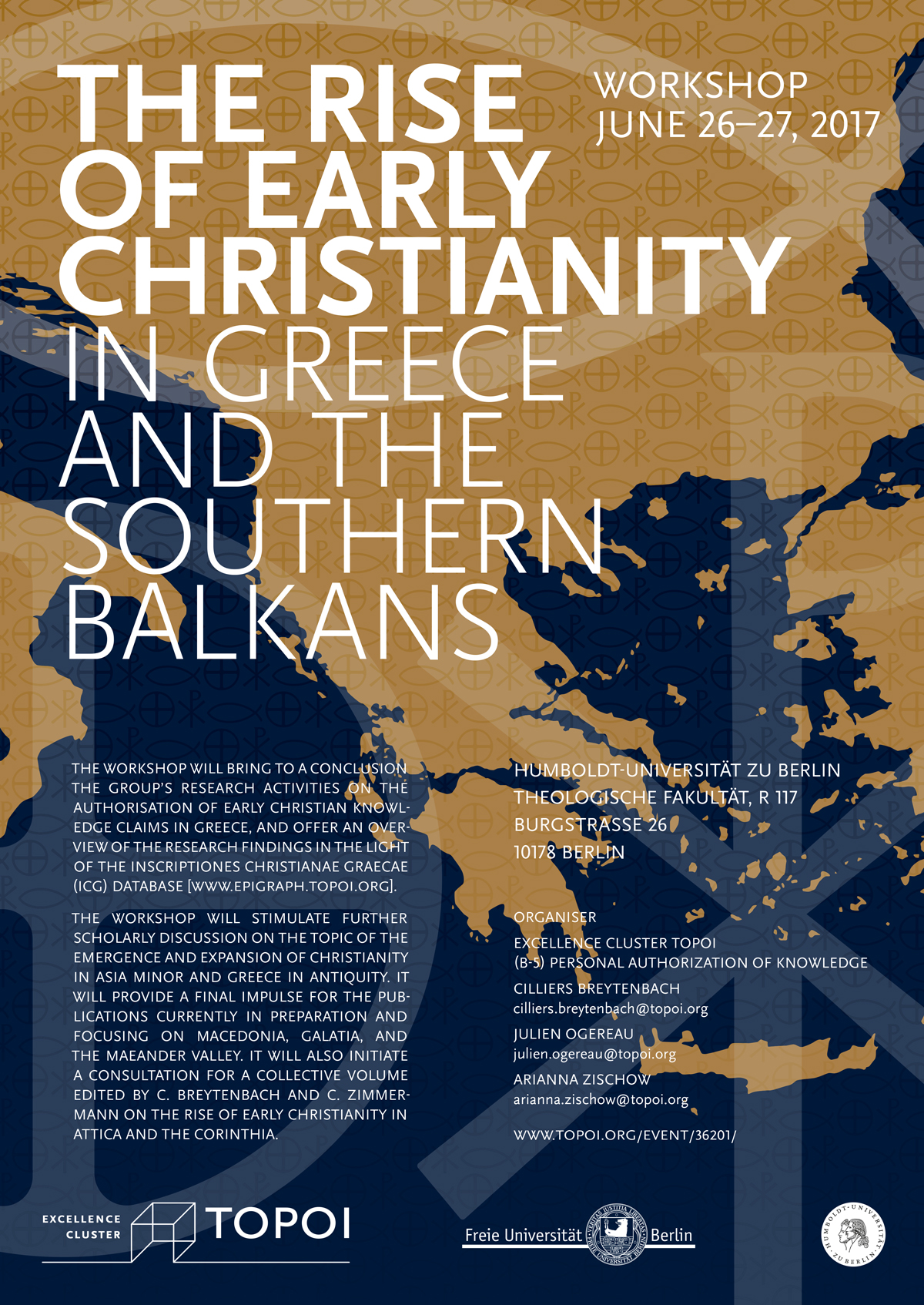 The workshop will stimulate further scholarly discussion on the topic of the emergence and expansion of early Christianity in Asia Minor and Greece in antiquity and provide a final impulse for the publications currently in preparation and focusing on Macedonia, Galatia, the Maeander valley. It will also initiate a consultation for a collective volume edited by C. Breytenbach and C. Zimmermann on the rise of Early Christianity in Attica and Corinthia.
