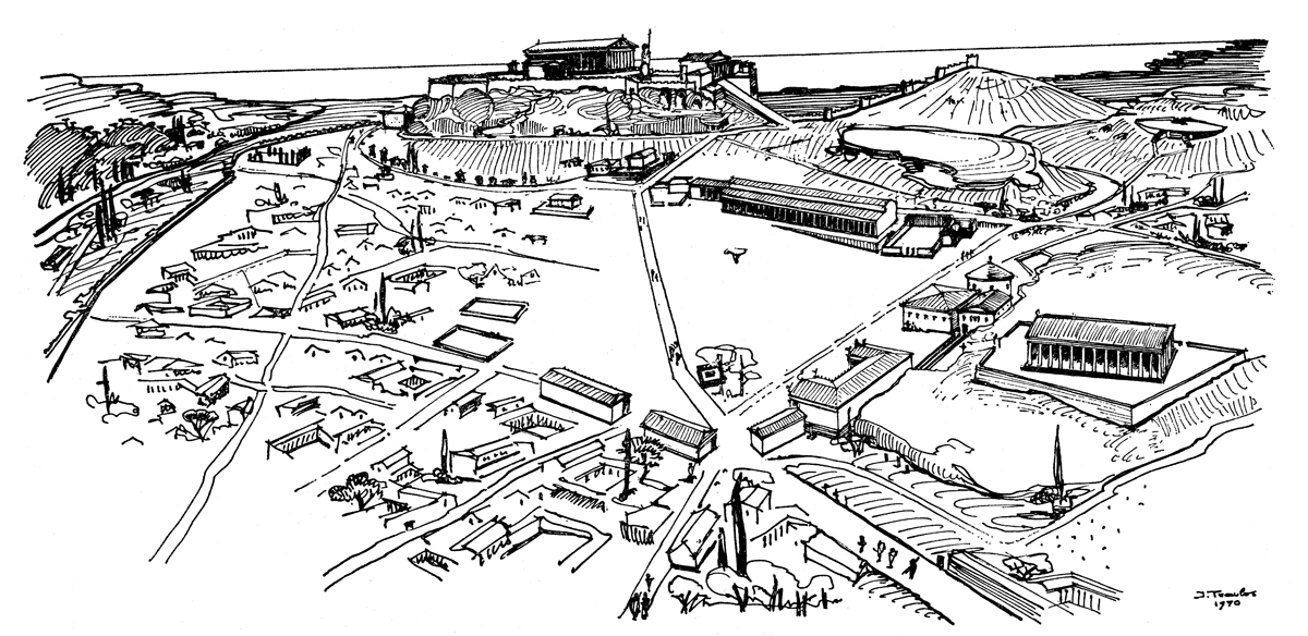 Image above: The Agora from northwest, middle of 4th century BCE | Author: Illustration by J. Travlos | Source: H.A. Thompson and R. E. Wycherley, The Agora of Athens: The History, Shape and Uses of an Ancient City Center, The American School of Classical Studies at Athens: 1972 | © The American School of Classical Studies at Athens