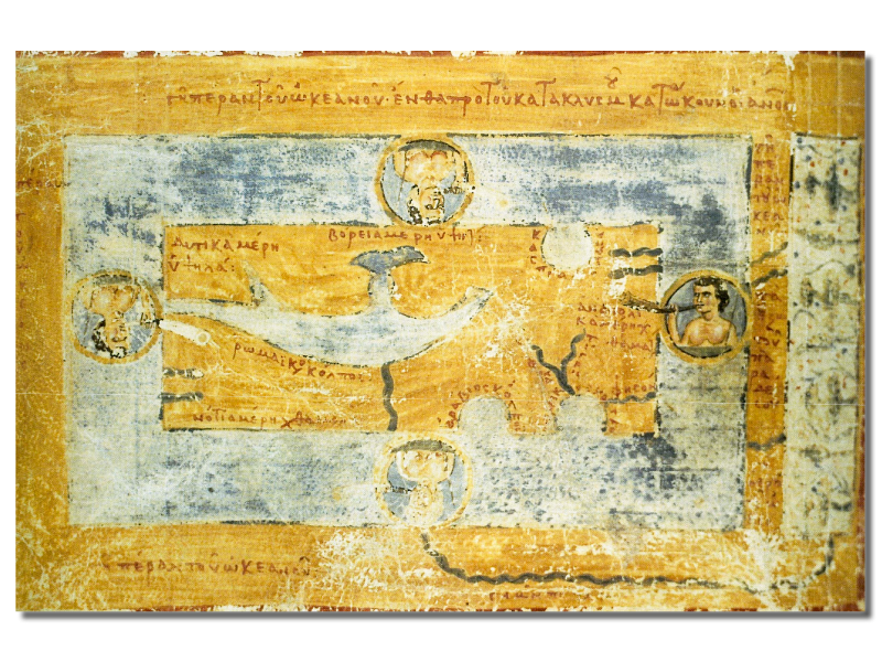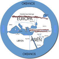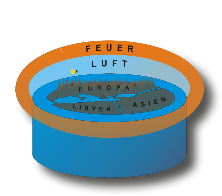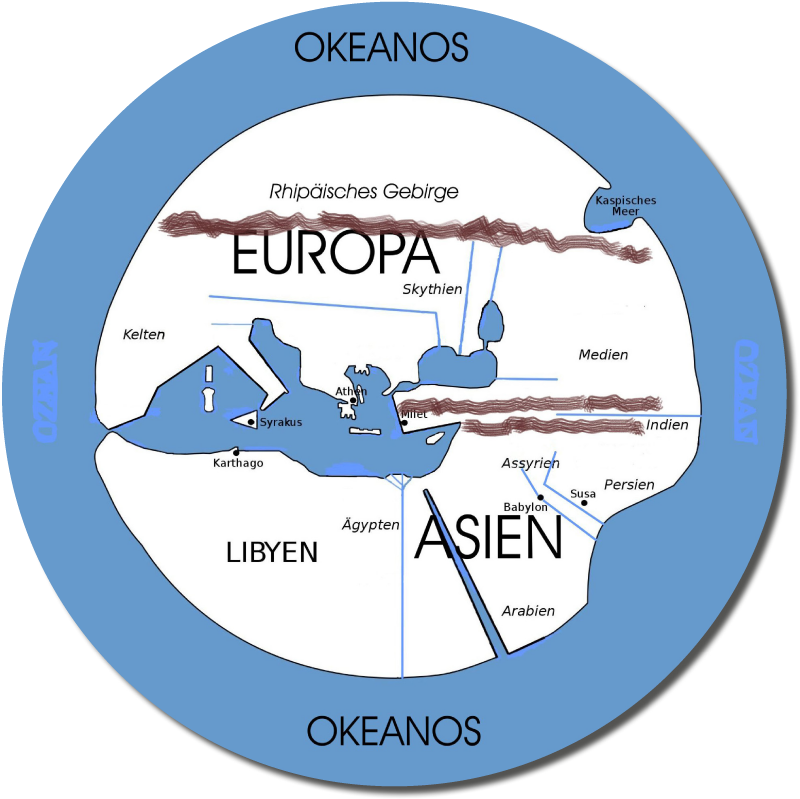Unserer Kenntnis nach war Anaximander von Milet im 6. Jahrhundert v. Chr. der erste, der eine geografische Karte der Welt der Antike entwarf. Wir wissen von ihr aus Fragmenten seiner philosophischen Schrift, die spätere Autoren zitiert haben. Diese Zitate bilden die Grundlage für moderne Rekonstruktionen, wie der hier gezeigten. Anaximander vergleicht die Welt mit einer Säulentrommel. Er stellte sie sich demnach als einen Zylinder vor. Auf dessen oberer Kreisfläche befindet sich – vom Ozean umflossen – die bekannte und bewohnte Welt.