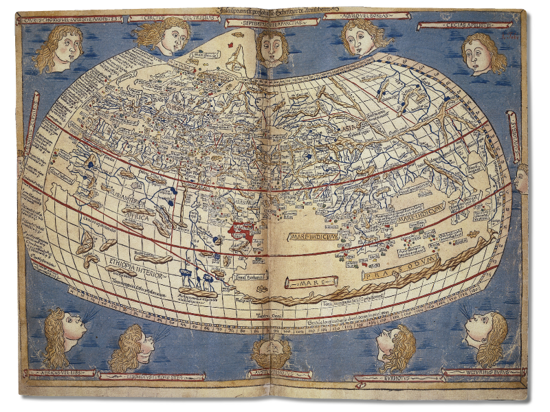 Exp06: Weltkarte des Klaudios Ptolemaios | Erste in Deutschland bei Lienhart Holl gedruckte ‚Cosmographia Claudii Ptolemaei Alexandrini’, hrsg. durch Nicolaus Germanus | Holzschnitt, 55 x 40 cm | Ulm, 1482 | Staatsbibliothek zu Berlin: Inc. 1743 |