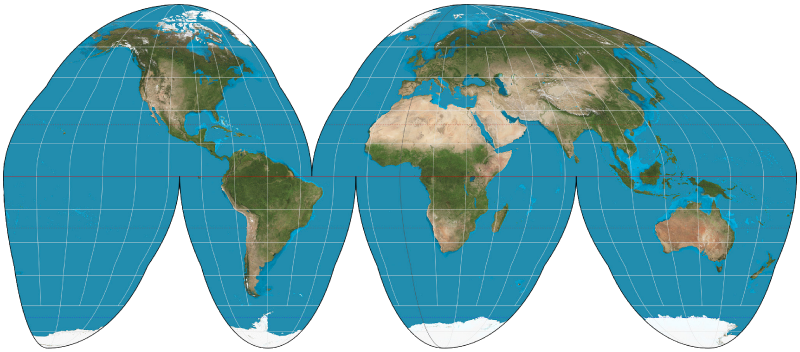 Exp08: Satellitenbild, bearbeitet nach der Projektionsmethode von Goode, entwickelt 1925 | Von Strebe – Eigenes Werk, CC BY-SA 3.0 | Link: https://commons.wikimedia.org/wiki/File:Goode_homolosine_projection_SW.jpg |