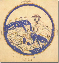 Hier sehen wir das Zeugnis eines spät-antiken Weltbildkonflikts. Es handelt sich um den ersten und für lange Zeit einzigen Versuch, eine umfassende Kosmologie in Übereinstimmung mit der Bibel zu entwickeln. Entgegen der heidnischen Vorstellung geht der Verfasser der ‚Christlichen Topografie des gesamten Kosmos’ aus der Mitte des 6. Jahrhunderts von einer flachen Erde aus. Die Welt ist als langrechteckige Fläche wiedergegeben. Sie ist um das Mittelmeer angeordnet und wird vom Ozean umgeben, zu dem sich noch das Rote Meer, der Persische Golf und auch das Kaspische Meer öffnen. Östlich des für die Menschen unüberwindlichen Ozeans liegt das Paradies.Exp09: Weltkarte des Kosmas Indikopleustes | ‚Christliche Topographie des ganzen Kosmos’ | Buchillustration auf Pergament, 23 x 31 cm | Konstantinopel (heute: Istanbul, Türkei), 11. Jh., verlorenes Original: ca. 550 n. Chr. |Peter Barber (Hg.): Das Buch der Karten. Meilensteine der Kartografie aus drei Jahrtausenden, übersetzt von Birgit Lamerz-Beckschäfer, Darmstadt 2006, S. 35 |