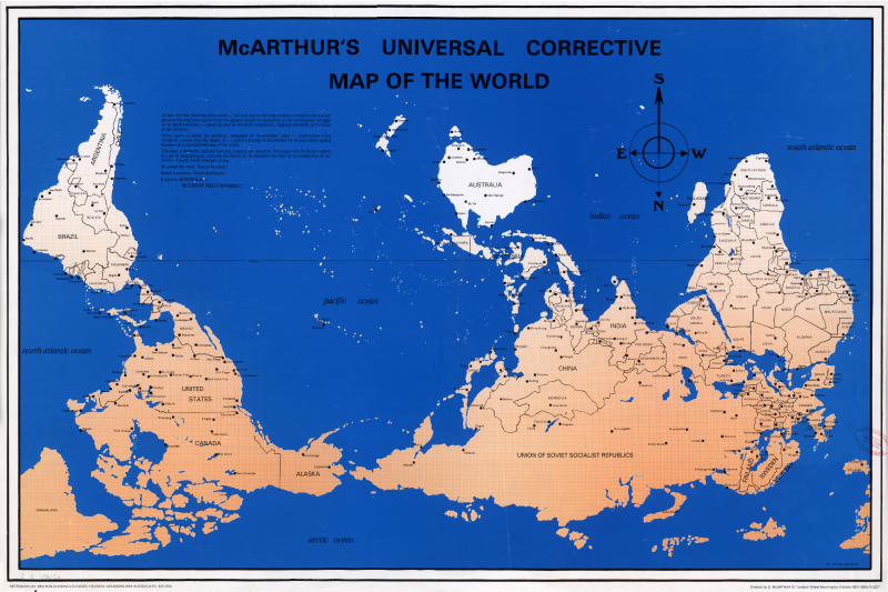 Ziel der Ausstellung ist es, unseren eurozentrierten Blick auf die Welt bewusst zu machen und unsere Sehgewohnheiten auch im übertragenen Sinn auf den Kopf zu stellen, ganz so wie es die oben zu sehende Weltkarte aus australischer Sicht für uns tut.
