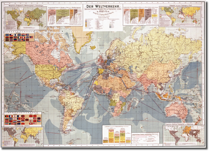 Exp17: Der Weltverkehr: Karte der Eisenbahn-, Dampfer-, Post- und Telegraphenlinien | Gustav Freytag, Lithografie, 90 x 64 cm | Wien, Österreich, 1895 | Museumsstiftung Post und Kommunikation |