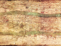 Diese Karte fällt durch ihr ungewöhnliches Format auf: Auf einst über sieben Metern Länge bei ca. 37 cm Höhe bildete sie die gesamte bekannte Welt ab – von Iberien im Westen bis Indien im Osten. Die Vorlage der äußerst kostbaren Prachtkarte aus dem 12./13. Jahrhundert lässt sich über mehrere Kopien möglicherweise bis ins 3. Jahrhundert v. Chr. zurückführen. Das Format der sogenannten Tabula Peutingeriana, durch ihre Handhabung als Buchrolle bedingt, hat eine extreme Nord-Süd-Stauchung und Ost-West-Dehnung zur Folge. Deswegen ist der italische Stiefel mit Rom in der Mitte nach Osten geklappt. Im Stil eines Metroplans sind das Straßennetz mit den Entfernungsangaben zwischen den einzelnen Etappen – und somit die Kommunikationswege – prominent hervorgehoben.ExpH2: Tabula Peutingeriana, Ausschnitt von ca. 2/3 der Gesamtlänge | Tinte auf Pergament, 660 x 37 cm | Wien, Österreich, 12./13. Jh. | Österreichische Nationalbibliothek: Cod. 324, Umzeichnung: Konrad Miller (Hg.): Die Weltkarte des Castorius. Genannt, Die Peutinger’sche Tafel, Ravensburg 1887 |