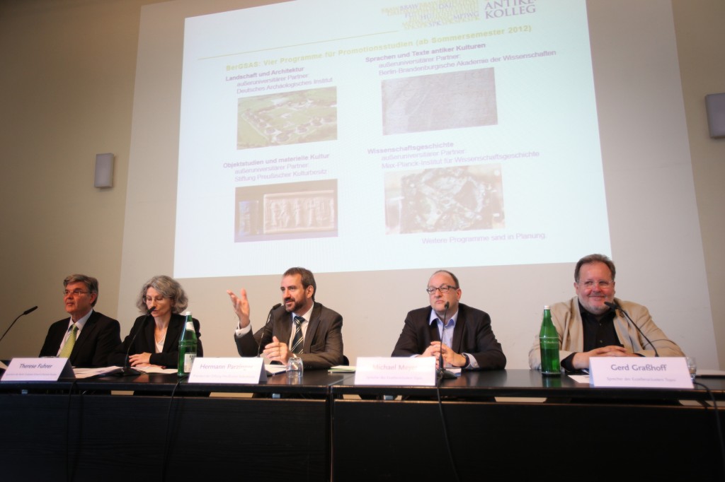 Die Arbeit der neuen Graduiertenschule “Berlin Graduate School of Ancient Studies” (BerGSAS) wurde von Cilliers Breytenbach und Therese Fuhrer vorgestellt, die die Sprecherschaft übernommen haben. Die BerGSAS bietet ab dem Sommersemester 2012 vier Promotionsstudiengänge an: Mit den Themen “Landschaft und Architektur”, “Objektstudien und materielle Kultur”, “Sprache und Texte der antiken Kulturen” und “Wissenschaftsgeschichte” werden gemeinsame Schwerpunkte und fachspezifische Erfordernisse miteinander verbunden. “Die Graduate School verbindet die Expertise der außeruniversitären und der universitären Partner. Davon profitieren die Promotionsstudenten ganz besonders”, erklärte Therese Fuhrer.