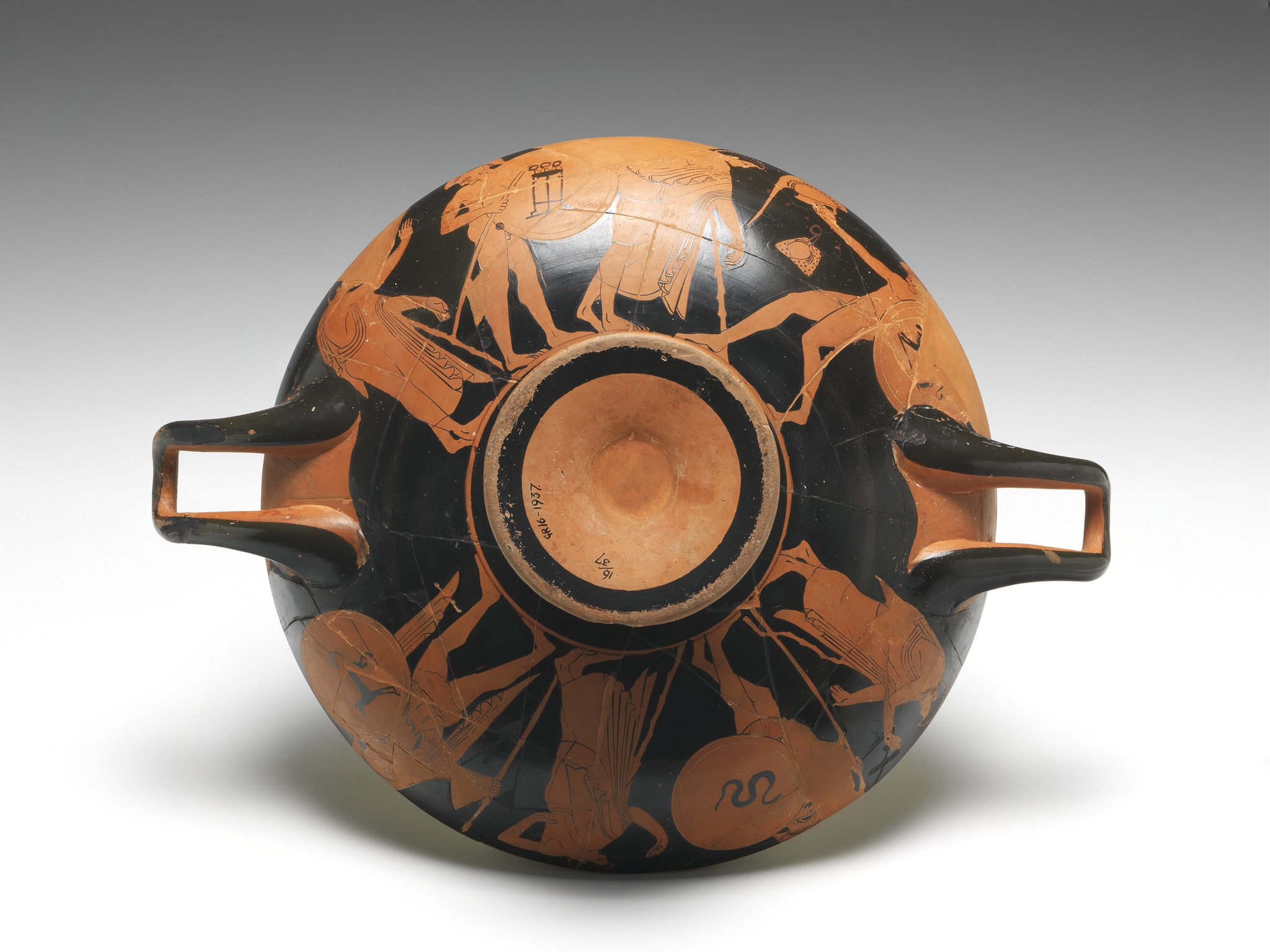 A red-figured archaic Kylix, by the Berlin Painter depicting warriors and draped youths at the Fitzwilliam Museum. © Fitzwilliam Museum, Cambridge