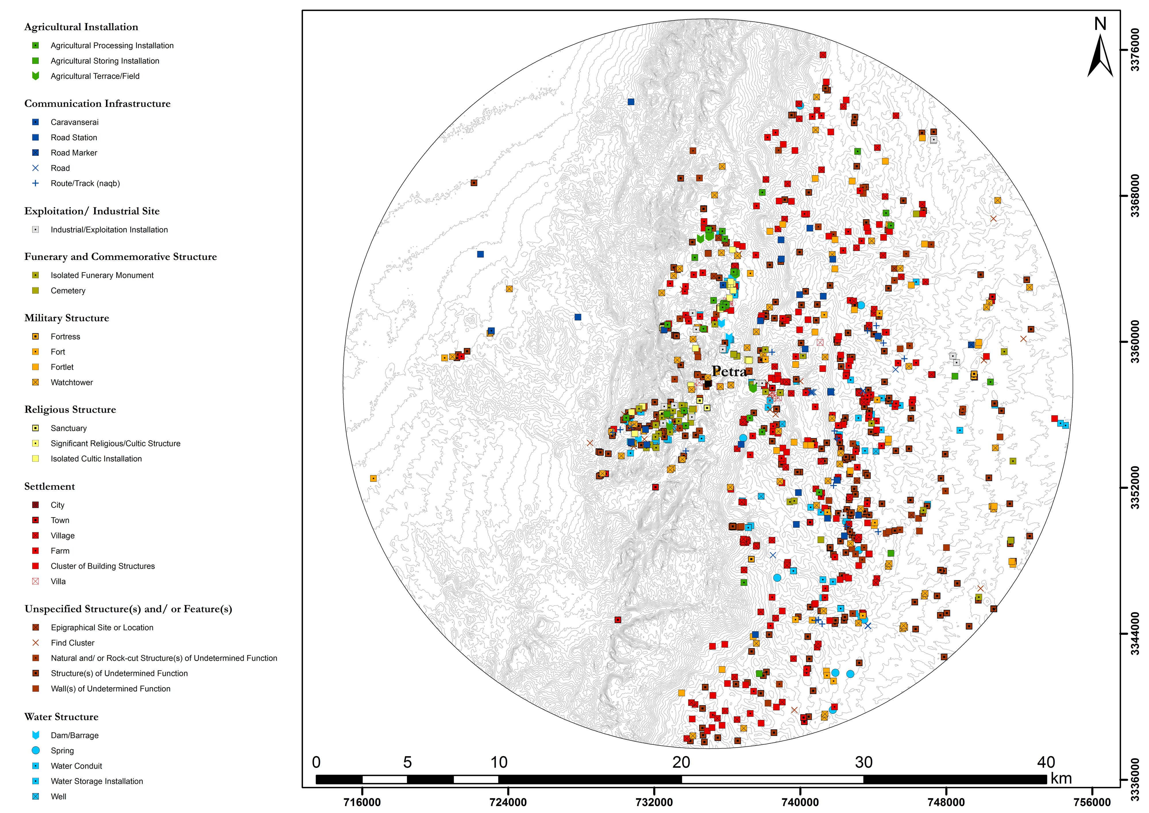 Fig. 1 :Site distribution map of archaeological sites evidenced for the 1st century AD in the Petraean hinterland (20km radius around Petra) | Author: W. M. Kennedy (click to enlarge)