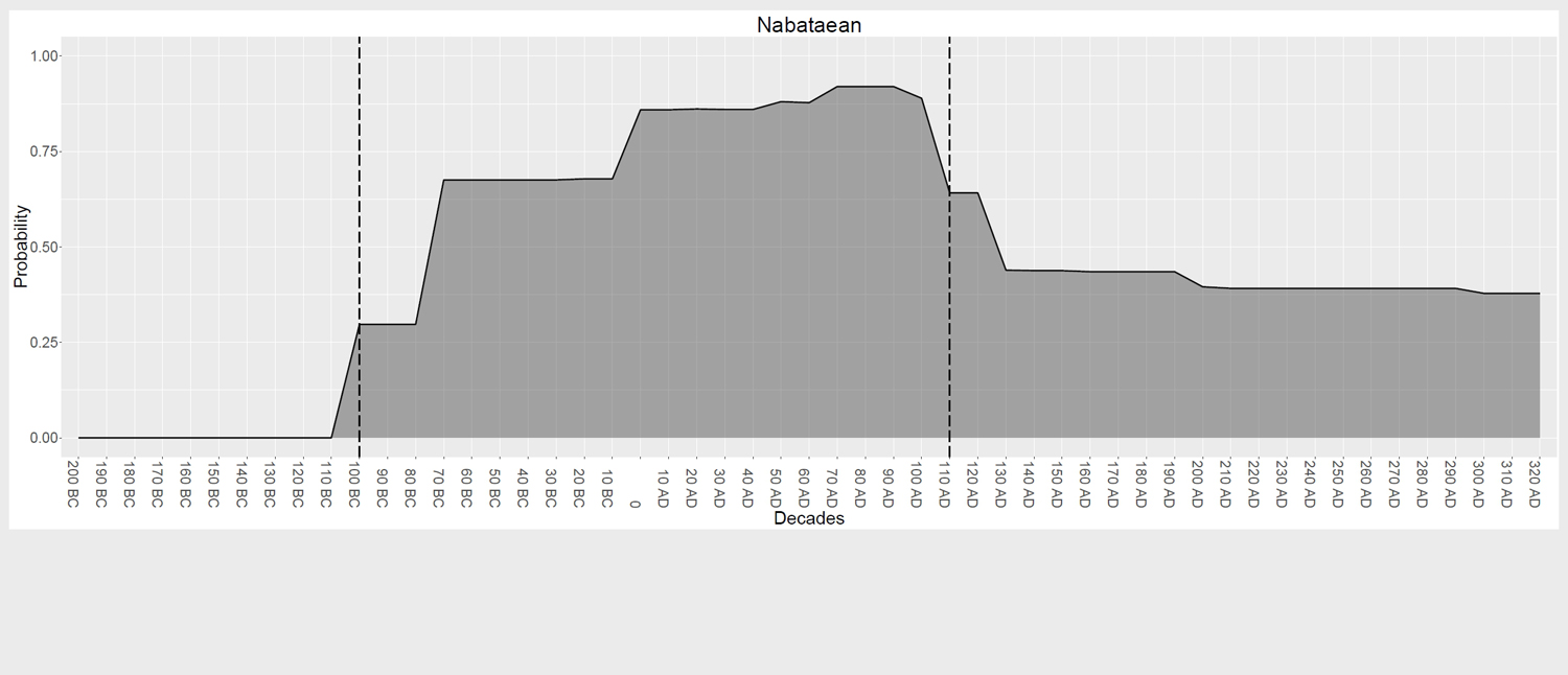Fig. 2: Dating probability graph for the Nabataean Period as stated by the original reports. The dashed lines represent the limits of the more realistic classification of the period | Author: W. M. Kennedy | Click to enlarge