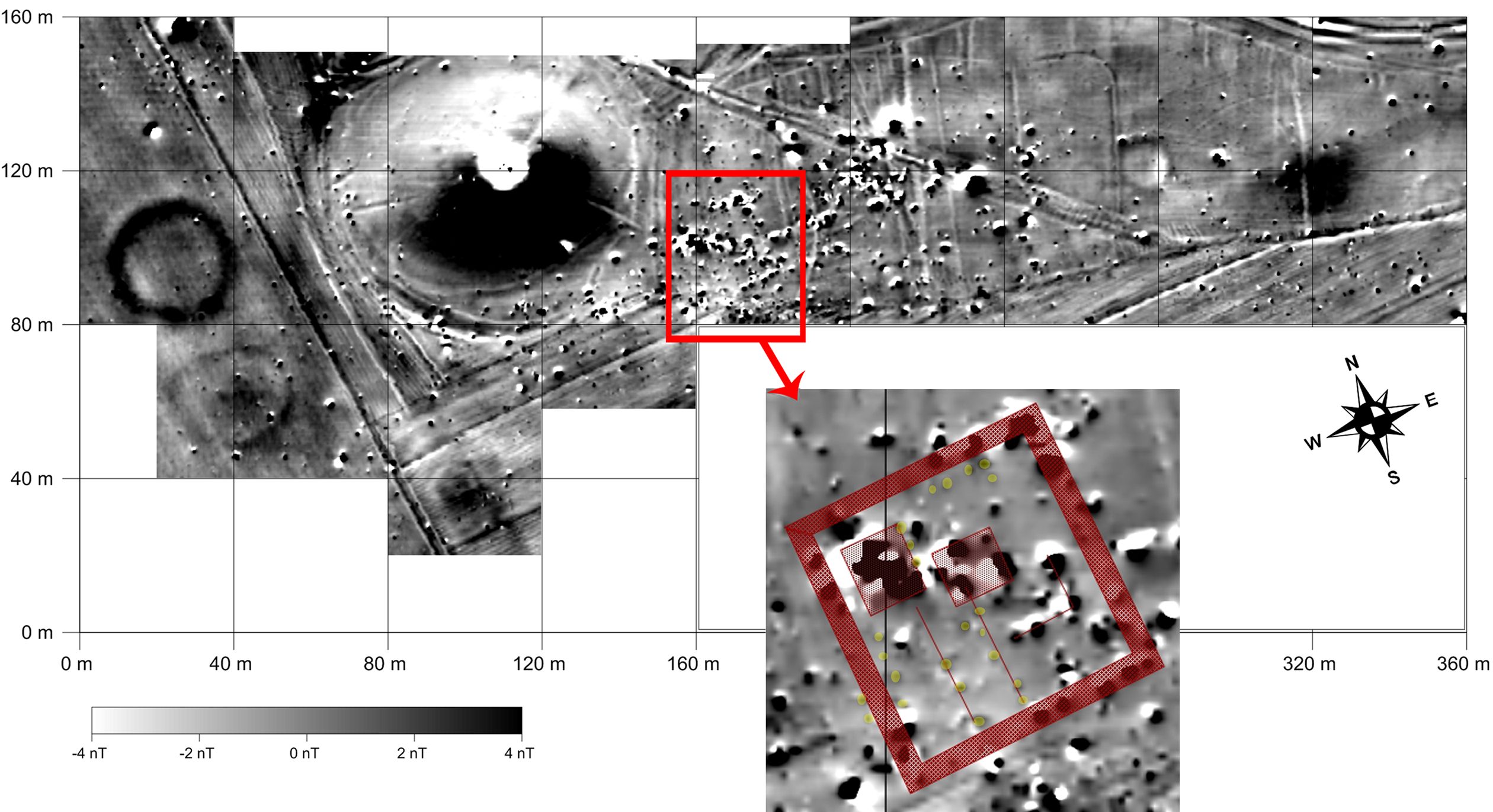 Fig. 3: Magnetogram of the Early Iron Age necropolis and the adjacent Bi-Tjube periphery. Enlargement of architectonic findings. Magnetometer survey using Smartmag SM4G-Special cesium-magnetometer, sensitivity ±10 pT, variometer (duo-sensor) configuration, 40 x 40 m grid, spatial resolution 12.5 x 50 cm, interpolated to 25 x 25 cm, total intensity of the earth magnetic field: ca. 50.270 +/- 30 nT (April 2015), dynamics ± 4 nT, grey shade plot in 256 greyscales (red – stone foundations; yellow – postholes). Magnetogram: Jörg Fassbinder, Andrei Asăndulesei | © Jörg Fassbinder, Stiftung Preußischer Kulturbesitz /Prussian Cultural Heritage Foundation