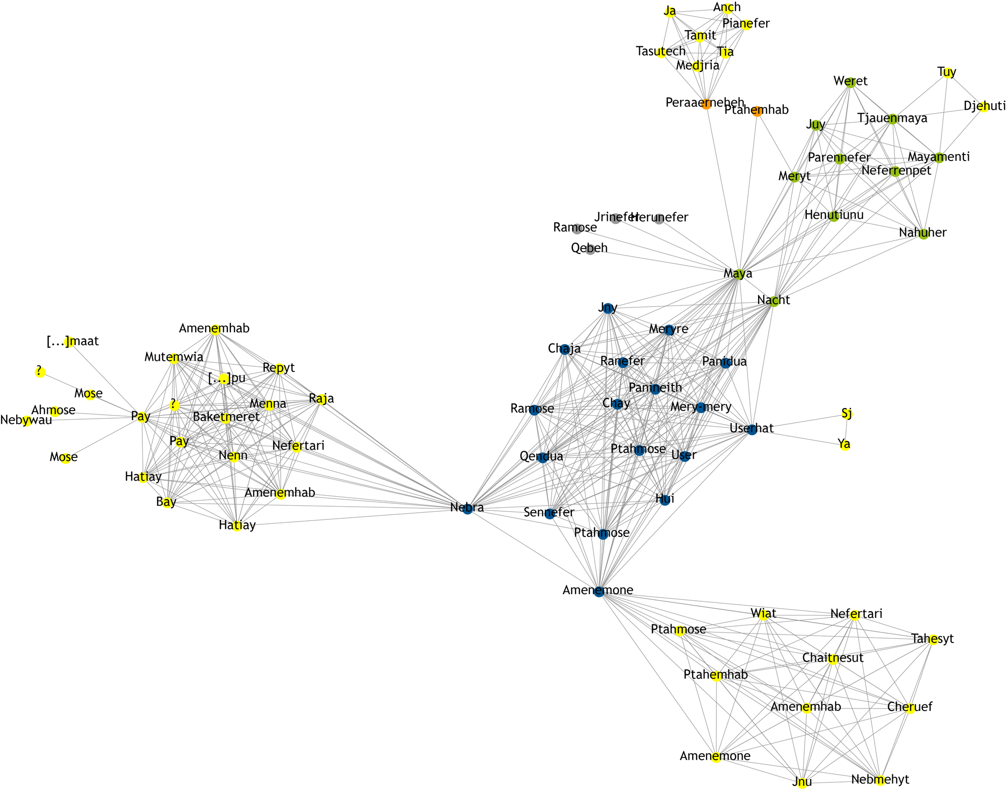 A first pilot case network of the king’s treasurer Maya has already been created and presented at the conference “Altertumswissenschaften in a Digital Age“. The most striking advantage of SNA was recognizable at a first glance: by using SNA the Memphite society is no longer understood as a mere sequence of individuals and their direct relatives, as it is the case in family trees, but connects individuals affiliated to different families, professional areas and social classes.