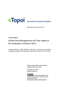 The aim of this article is to show examples of the impact of human activities on the landscape in a selected zone from Southern Syria. This article discusses the archaeological evidence that can be exploited to show this impact. The successive survey campaigns allow recognition of the different aspects of landscape evolution, due to human activities. This study depended on the use of 1:25,000 and 1:50,000 scale Syrian topographic maps of the region dating from the sixties of the 20th century and written in Arabic, besides the aerial photographs taken by the French mandate air forces in the 1920s and 1930s, as well as those taken by the Russians in 1958, and Google Earth images. All these documents have been scanned and are available in digital form and preserved at the UMR 7041, Ar-ScAn, APOHR team, Maison René Ginouvès, l’Archéologie et l’Ethnologie de Nanterre in France.