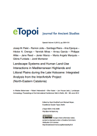 Josep M. Palet, Ramon Julià, Santiago Riera, Ana Ejarque, Hèctor A. Orengo, Yannick Miras, Arnau Garcia, Philippe Allée, Jane Reed, Javier Marco, Maria Angels Marqués, Glòria Furdada and Jordi Montaner, "Landscape Systems and Human Land-Use Interactions in Mediterranean Highlands and Littoral Plains during the Late Holocene: Integrated Analysis from the InterAmbAr Project (North-Eastern Catalonia)", in: Landscape Archaeology Conference (LAC 2012), eTopoi. Journal for Ancient Studies, Special Volume 3 (2012), 305–310
