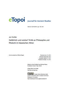 The arrival of philosophy and the art of rhetoric in 5th and 4th B.C. century Athens has left its mark on the city’s cultural life as well as on classical culture in general. The process was, however, accompanied by a sometimes heated discussion about the dangers the new education was expected or supposed to have for the community. This critical discussion cannot be dismissed as mere comical mockery, or be reduced to underlying political conflicts alone. In Athens, the new education’s implications for the communal life of the polis were for the first time discussed in front of a larger public. The first indepth reconstruction and analysis of this discourse has been the aim of my PhD thesis, made possible by a grant from the Excellence Cluster Topoi. This paper recapitulates its mayor results.