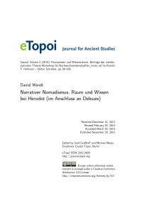 In the Treatise on Nomadology in Thousand Plateaus (1980) Gilles Deleuze and Félix Guattari develop nomadism as a spacial and epistemological concept. ‘Nomadic science,’ they say, offers an event orientated access to knowledge through another relation to space and thus resists to the reproduction of stereotype discourses. The paper transfers nomadology to narratological questions and analyses some programmatic passages from Herodotus’ histories regarding the connection of space, knowledge and text. Verbs of going, seeing and hearing are of great significance within these scattered methodological statements. Herodotus stages his research as virtual journey through different places of knowledge. He presents, I would argue, his own method as a nomadic track (in contrast to didactic poetry). This leads to a different narrative and epistemic approach, towards a cartography of knowledge. Finally, by introducing the category of personal knowledge Herodotus creates a performative historiography.