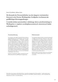 Die Anzahl der in die jüngere vorrömische Eisenzeit datierten Siedlungsfundstellen der Przeworsk-Kultur, die bei den großflächigen Rettungsgrabungen in Wielkopolska (AutobahnA2, Gasleitungen Wolsztyn-Kościan u. Gustorzyn-Odolanówsowie die Schnellstraße S5) entdeckt worden sind, ist bescheiden. Anhand der Analyse des geborgenen keramischen Materials sind vier Basistypen von Gefäßen ausgesondert worden. Hinsichtlich der Technologie wurde festgestellt, dass die untersuchten Gefäße vor allem dem Spektrum der Gebrauchs- keramikzuzuschreiben sind. Es ist festzuhalten, dass die Besiedlung durch die Bevölkerung der Przeworsk-Kultur in der jüngeren vorrömischen Eisenzeit in Wielkopolska sehr dünn war. Die älteste Stufe (A1) ist in den hier behandelten Fundkomplexen nicht vertreten.