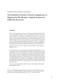 From an archeological perspective, this article discusses sacred mobility and ritual movement in Greek Hellenistic festivals. It focuses on the Panhellenic festival of Artemis Leukophryene in Magnesia-on-the-Meander. Instructively, this festival shows the various forms of festive movements in ancient Greece and their contextual meaning. Firstly, the article examines movement during the preliminary stages of the festival as an instrument to create a cultural framework. Secondly, it takes a look on the procession conducted in the festival in which the celebrating community mediated an image of its civic identity. The architecture, monuments, and inscriptions of the Magnesian topography are given due consideration to gain information about trajectories, participants, and the procession’s ritual framework.