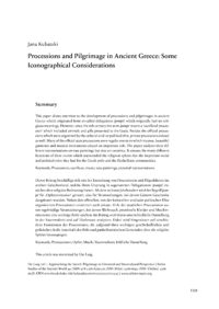 This paper draws attention to the development of processions and pilgrimages in ancient Greece which originated from so-called delegations (pompé) which originally had no religious meanings. However, since the 6th century the term pompé meant a ‘sacrificial procession’ which included animals and gifts presented to the Gods. Besides the official processions which were organized by the cultural and/or political elite, private processions existed as well. Many of the official state processions were regular events in which incense, beautiful garments and musical instruments played an important role. The paper analyses their different representations on vase paintings but also on ceramics. It stresses the many different functions of these events which transcended the religious sphere due the important socialand political roles they had for the Greek polis and the Panhellenic communities.