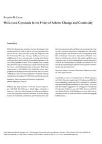 While the old gymnasia (Academy, Lyceum, Kynosarges) were situated outside the walls of Athens, two new gymnasia were built in the city’s heart soon after 229 BC: the Diogeneion and the Ptolemaion. This paper discusses the history, architecture and function of these two gymnasia, reviewing both literary and epigraphic evidence and the archaeological remains in the area of their probable location. These complexes had a remarkable urbanistic impact, introducing a touch of modernity into the chaotic and old-fashioned centre of the town. While their exact location is still debated, they established a firm topographical and ideological connection with the older city-centre (‘Old Agora’) and served the headquarters of ephebic training and education throughout the Hellenistic and Roman periods.