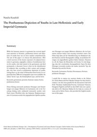 While the honorary practice in gymnasia has received significant attention in literature, posthumous honors and depictions of youths have not yet been studied comprehensively. The aim of this paper is to discuss this phenomenon. After a brief overview of the known repertoire of sculptural decoration in gymnasia, epigraphic evidence of posthumous honors for youths, who had trained in the gymnasium and died prematurely, is discussed. Focus is then on the identification of sculptures that, according to their context and iconography, may have served as posthumous depictions of youths, among them e.g. the statue of Kleoneikos from Eretria. It is argued that three different iconographic types were available: the naked, ‘heroic’ type, the himatiophoros type, and the herm.
