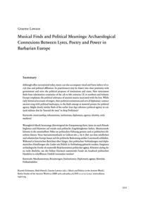 Although often recreational today, music can also accompany ritual and form indices of social class and political affiliation. Its practitioners may be drawn into close proximity with government and serve the political purposes of institutions and states. New instrument finds from inhumation cemeteries of the 5th to 8th centuries CE in northern and Atlantic Europe emphasize the political relevance of ancient musics associated with the lyre. While early historical accounts of singers, their political connexions and acts of diplomacy connect ancient song with political landscapes, so the finds emerge as material proxies for political agency. Might closely similar finds of the earlier Iron Age reference political agency in cul-tural milieux that lie ‘beyond the texts’ in deep Prehistory?